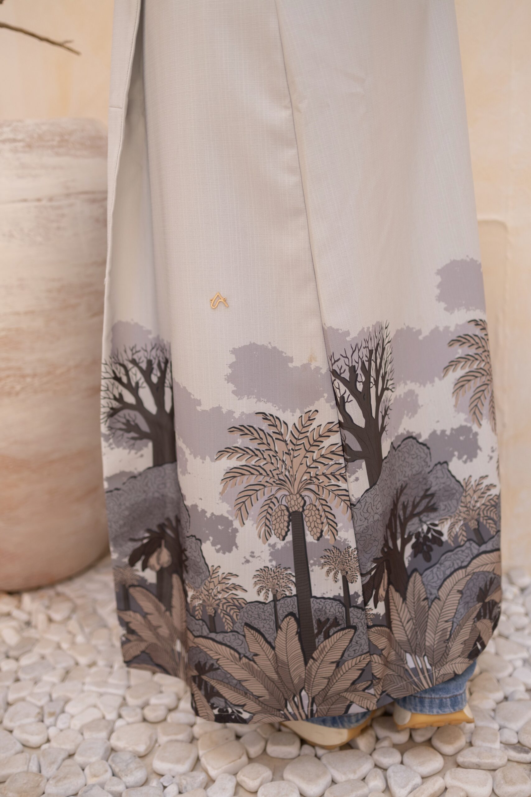 The Heritage Grove Kimono in Grey embodies sophisticated elegance through Africa’s timeless landscape. Hand-drawn motifs of majestic shea trees, ancient baobabs, palm and banana leaves are artfully printed on premium handmade linen, creating a flowing canvas that celebrates nature’s enduring beauty.