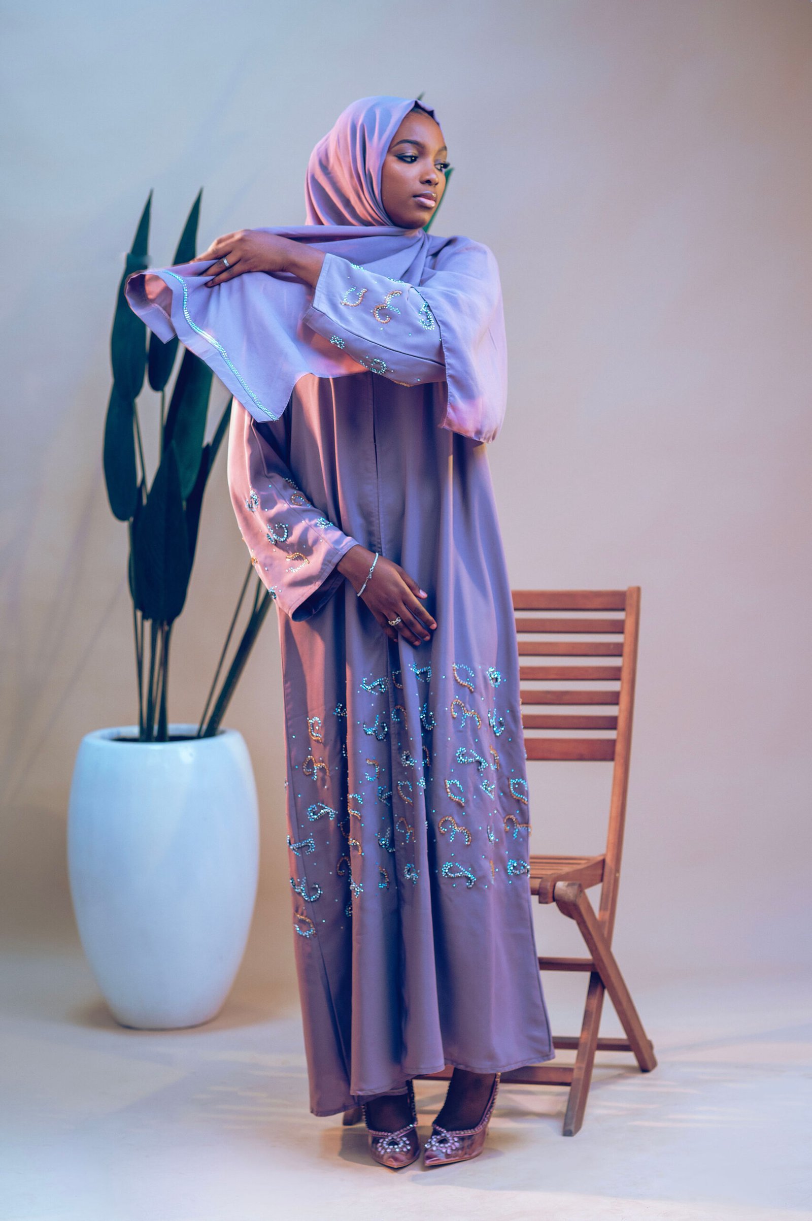 Introduce a touch of glamour to your wardrobe with our Stone and Beads Detailed Abaya, a stunning fusion of elegance and intricate design. This exquisite piece features a captivating arrangement of shimmering stones and delicate beads that adorn the neckline and sleeves, creating a breathtaking effect that glistens with every movement.